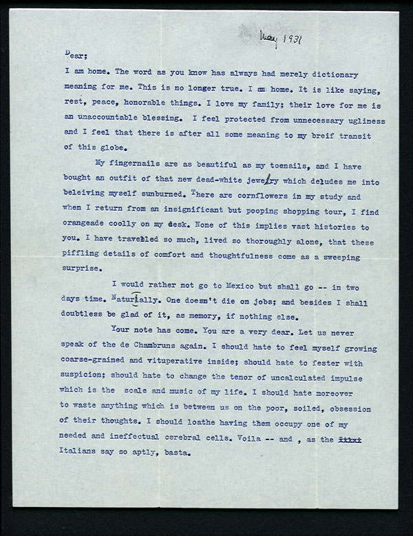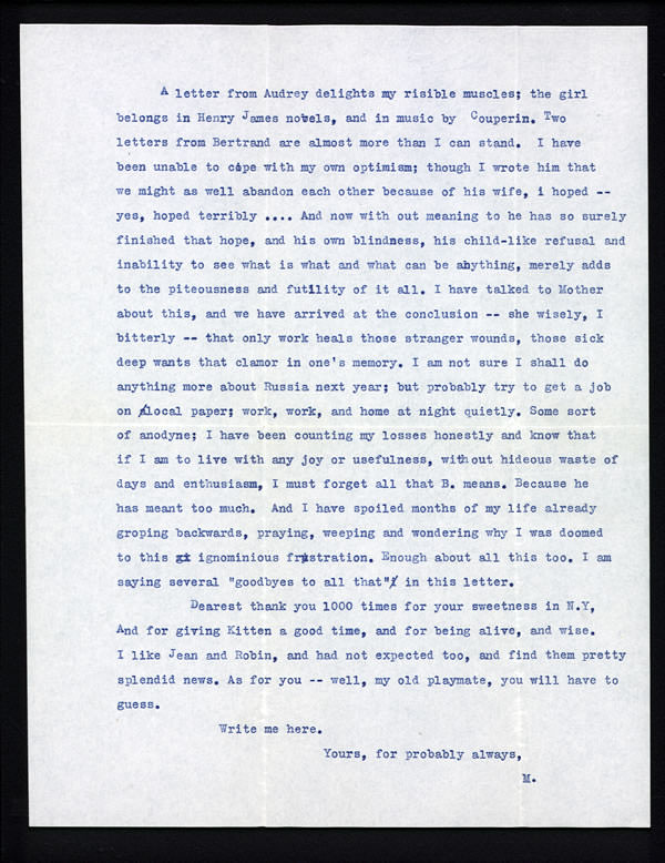 “Only work heals those stranger wounds, those sick deep wants that clamor in one’s memory.”~1931 letter to Cam Becket